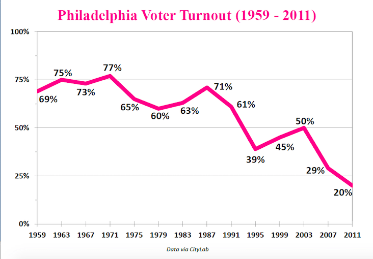 Nationally, it’s the same story: Turnout in the last non-presidential federal election in 2014 was just 36 percent—the lowest since World War II (when thousands of voters were otherwise occupied keeping the world safe for, well, democracy). If you still don’t think numbers matter, remember what happened this past November, when Hillary Clinton lost Pennsylvania by just 46,000 votes out of more than 5 million cast. In that race, 64 percent of eligible Philadelphians voted, less than in both 2008 and 2012. Imagine what could have been if every single Philadelphian had cast a vote for President in November. That’s right, just imagine it.