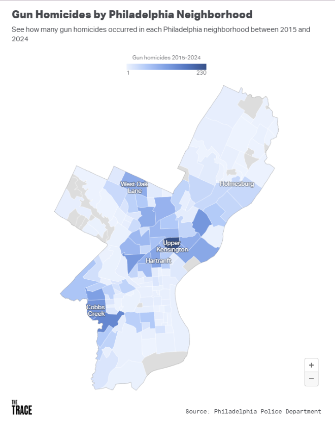 The analysis also found that the post-pandemic decline did more than erase the Covid-era shooting spike; as in many American cities, gun violence in Philadelphia is lower than it was 10 years ago. There were 1,294 shootings across the city in 2015; that number reached 2,269 in 2023, before falling to 1,112 in 2024. Gun homicide numbers tell a similar story. Homicides grew from 280 to a peak of 562 in 2021, before landing at 268 last year.