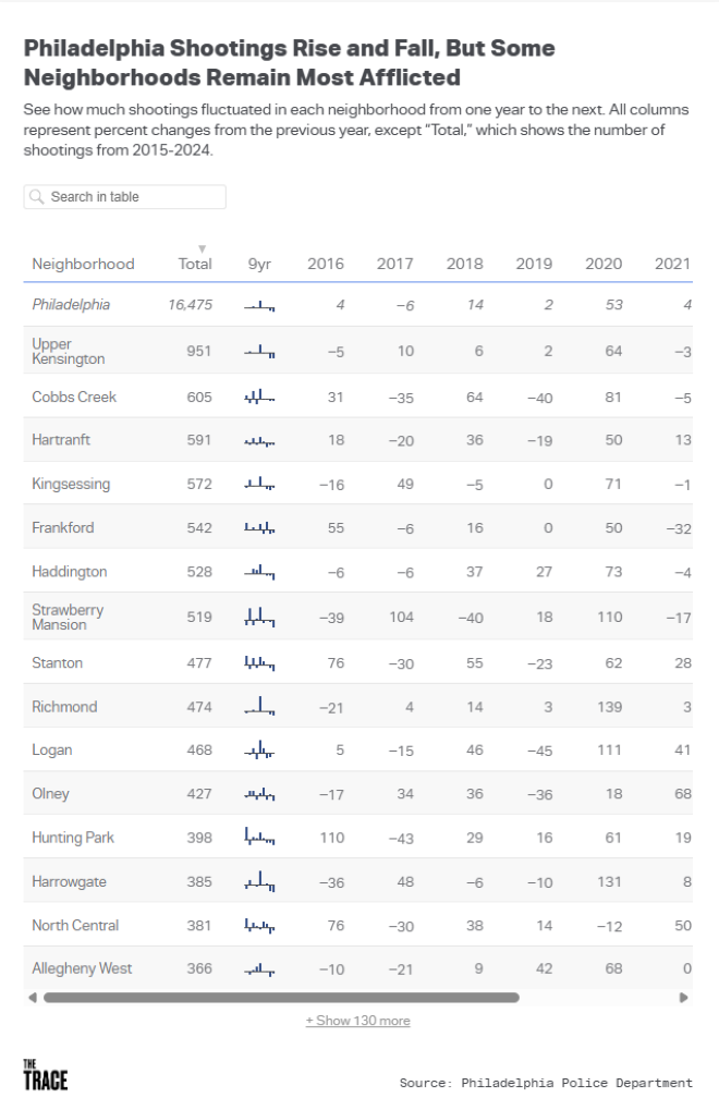 On the other end of the curve, a small collection of neighborhoods — including some with the smallest populations, saw the fewest shootings, each experiencing a total of one incident between 2015 and 2024: Andorra, Chestnut Hill, Dearnley Park, Normandy Village, Wissahickon, and Wissahickon Park.