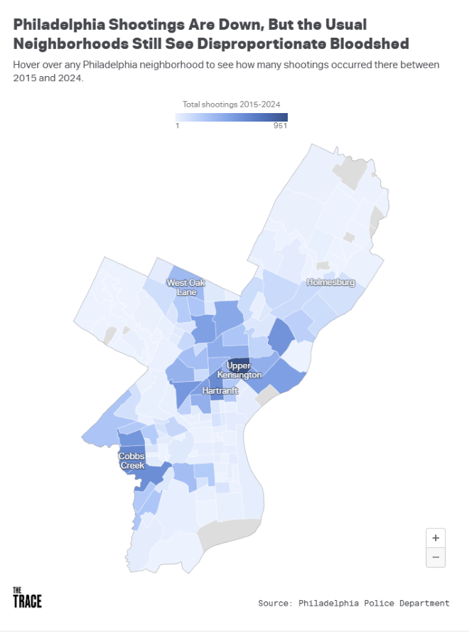 An analysis from The Trace’s Gun Violence Data Hub underscores this dissonance. The Data Hub looked at shooting and gun homicide data in nearly 150 Philadelphia neighborhoods between 2015 and 2024 and found that, while almost every area saw fewer shootings, the places that started as the most violent remained so during that time span.