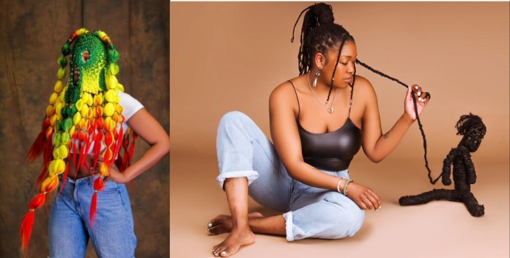 DeJeonge Reese makes modern sculpture out of synthetic hair. Reese came up with the idea as a student at Moore College of Art when she began her own locing journey and began researching the history of Black hair culture. Her work explores hair as both material and metaphor and affirms Black identity and challenges beauty norms.