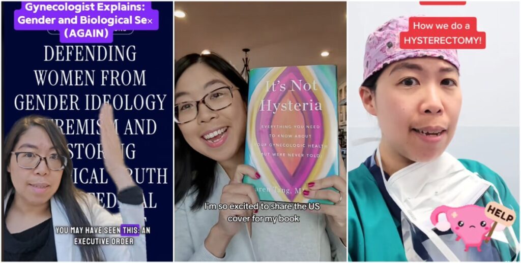 Examples: She’s gone viral for posting a tubal ligation (to the tune of APT) along with videos about period poops, biological sex diversity, endometriosis, birth control, hysterectomy, perimenopause … Tang’s posts are factual and transparent, but also fun enough to amass her hundreds of thousands of followers on Instagram and TikTok. For followers who prefer printed to social media, she’s also authored It’s Not Hysteria about gynecological reproductive health.