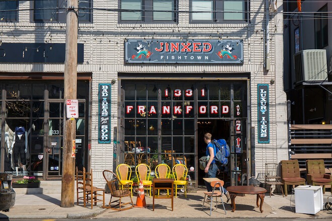 The upbeat music and multicolored lights set the tone at Jinxed Fishtown, 1331 Frankford Avenue, one of five Jinxed secondhand stores. Inside, customers can find furniture, vintage clothing, light fixtures, and other treasures. New (old) stock arrives multiple times each week, so new-to-you merch is always making their way onto the shelves and sales floor.