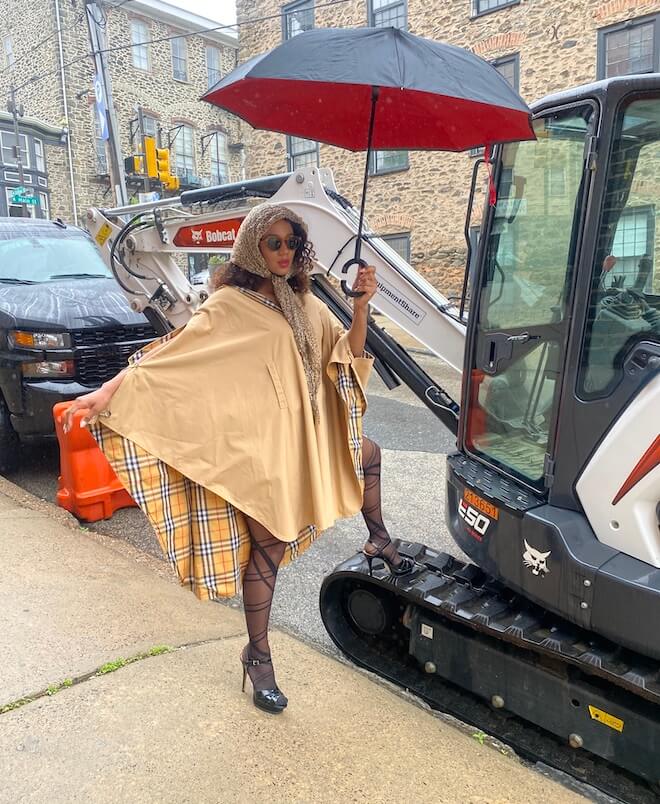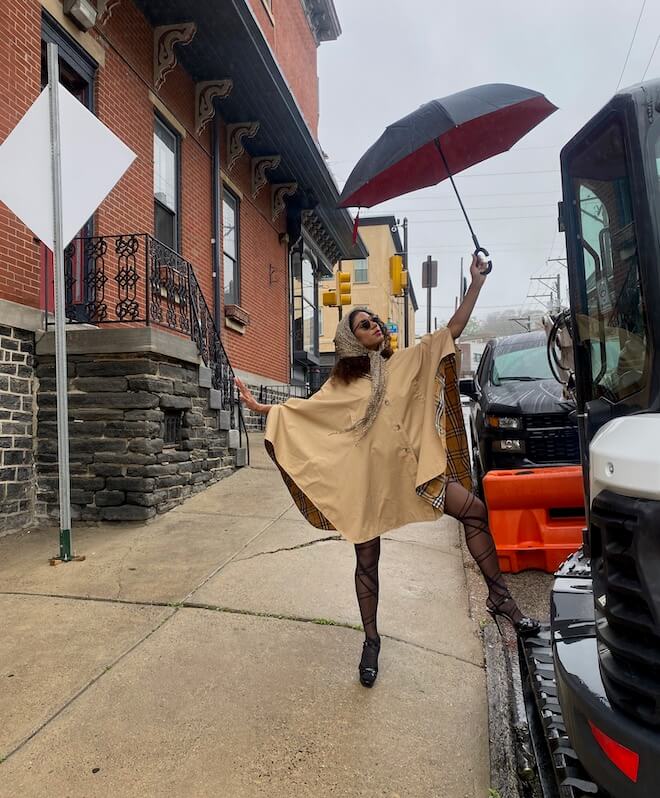 A couple of years ago, we found each other again, again in Rittenhouse. She was having dinner with her friend, an actor from Insecure, at Parc. I was there with friends and my lady. Brielle and I didn’t miss a beat. She calls me, and I’m there. I need a model; she’s there. She and her girlfriend were my guests at Philly Fashion Week. I styled them both. When Brielle arrived, she stayed in the car, nervous about her avant garde outfit. She called me up and I said, Get in here.