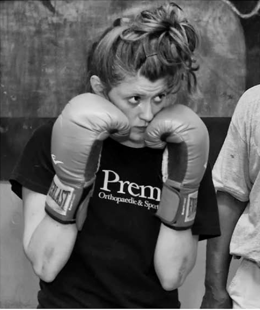 Allison Robertson (Alli) is a slender, White, young woman and a medical editor for exams and patient safety. She isn’t a typical member of this gym. I asked her why she boxes. “I like to hit people.” Her coach Sam Davis has her work out with the guys, but they aren’t allowed to hit her back. Allison Robertson did some boxing in college but only fought once. When she ended up with two black eyes, she decided to box just to improve her fitness. Sam says she has a lot of skill. He puts her through the same training regimen he does the male fighters.