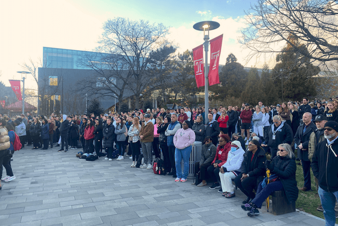 Hundreds from the campus and surrounding community gathered around Temple’s bell tower for Fitzgerald’s vigil, during which his wife and father spoke of his passion for being an officer and a family man.