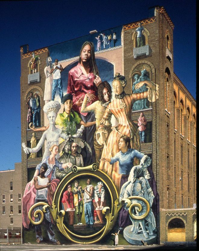 A year later, Golden was awarded The Philadelphia Award — the city’s highest civic honor — alongside legendary Philadelphia Museum of Art CEO Anne d’Harnoncourt, a moment she later described as a “turning point both professionally and personally.” In part, that’s because it was the first time her work was truly acknowledged as on par with that in the city’s storied museum on the hill. In a dress her mom bought for her, Golden gave an acceptance address that so moved the keynote speaker for the event — the head of the Ford Foundation, a college friend of d’Harnoncourt — that the woman invited Golden to visit her in her New York office. Golden brought some of her young muralists with her, and left with a $175,000 grant.
