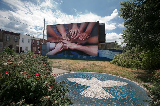 When Golden told DiBerardinis and Rendell that she wanted to paint a peace mural in Grays Ferry they “thought we were very naive to think that it could help,” she recalls. Still, Golden insisted. At first, folks in the neighborhood wouldn’t talk to MAP. Then, Golden started knocking on doors with Lillian Ray, a Black assistant deputy mayor. Eventually, they gathered dozens of neighbors to a community meeting, where they decided they wanted the mural to depict hands. Golden’s husband, a filmmaker, had the idea that they should be real people’s hands, so they held a photo session in a church, with Black and White residents, adults and children, holding their hands together in a circle. That photo became the basis of the PDR Peace Wall, which still hangs over the neighborhood.