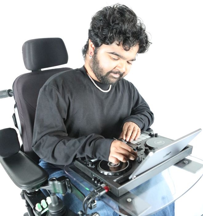 Gambhir developed his own adaptive DJ setup by repurposing controllers and connecting them to his computer, complete with modulators and synthesizers you’ll find on the most complex decks. “Even now, I have very limited mobility,” he says “But you can see me at the club, moving like this, nodding my head, especially when I’m doing my set. It all kind of ties into my overall view on life, of still being able to party despite the challenges.”