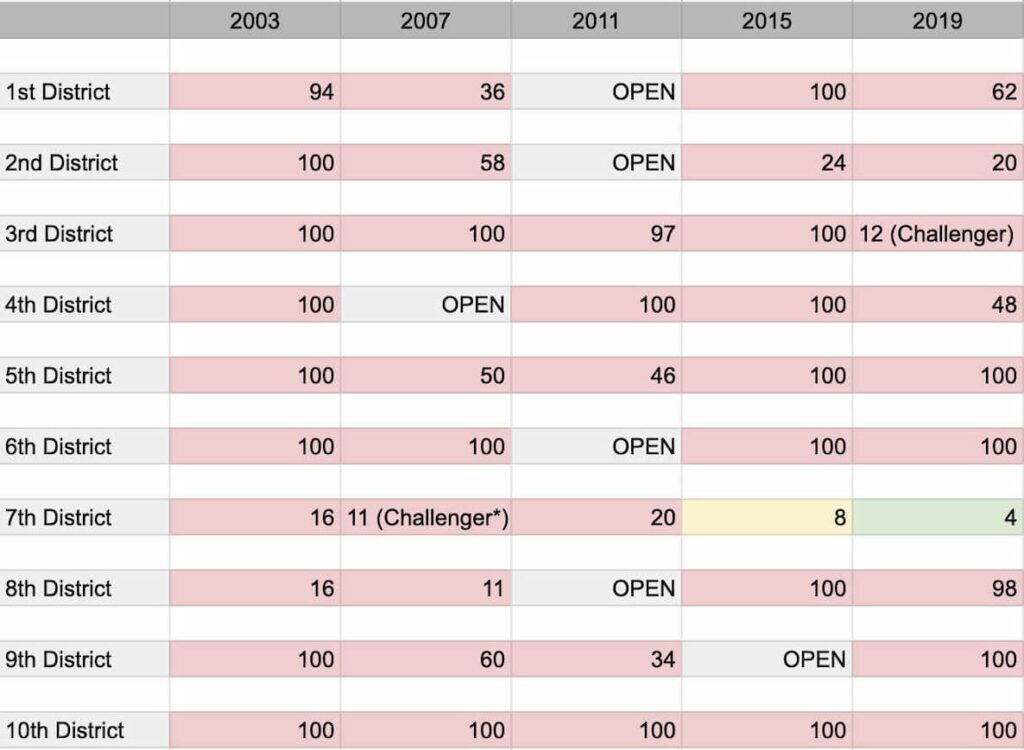 The red cells are races where the incumbent won by more than 10 points, which is a rough cut-off for a race being even relatively close. Nearly every race is in red, and in most of these races, the incumbent won by over 90 points.