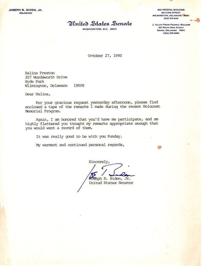 Biden had been remarried to Jill Biden and was already established in the Senate when my mother invited him to speak at a 1980 ceremony at a newly erected Holocaust monument in Wilmington. My father served on the monument committee and delivered the main address, and I was among 11 children of survivors who lit memorial candles. Biden sent my mother a personal note thanking her for inviting him, and enclosed an audiocassette of his remarks.