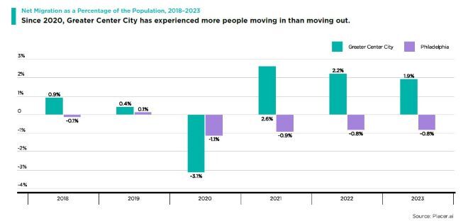 Like most large downtowns, Center City experienced urban flight in 2020 but resumed its growth trajectory in 2021. According to Placer.ai data, there was a net in-migration of 12,100 people to “Greater” Center City (core + extended) from 2021 to 2023 (see graph below), and by November of 2023, residential foot traffic was 34 percent higher than four years earlier.