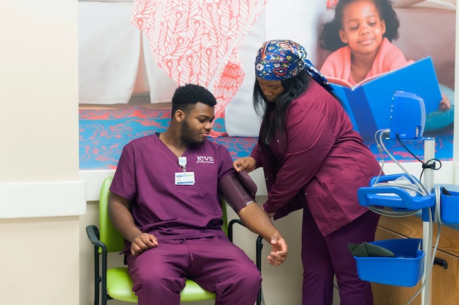As the program grows, freshmen and sophomores will take Intro to Health Pathways one and two, juniors will complete hospital internships, and seniors will sit for certification exams. Nichols will continue to pair students who pass those exams with externships at CHOP — a crucial opportunity, she says, particularly because the positions are paid.