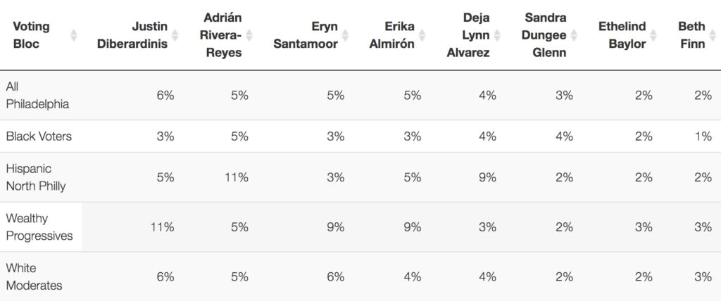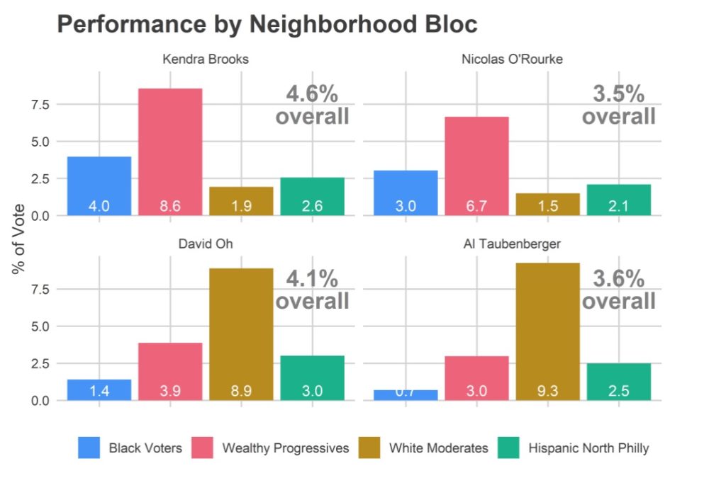 Here is an example from Tannen’s post-election wrap post showing where Kendra Brooks’s votes came from in terms of these voting blocs, and the different share of the electorate that each group comprised: