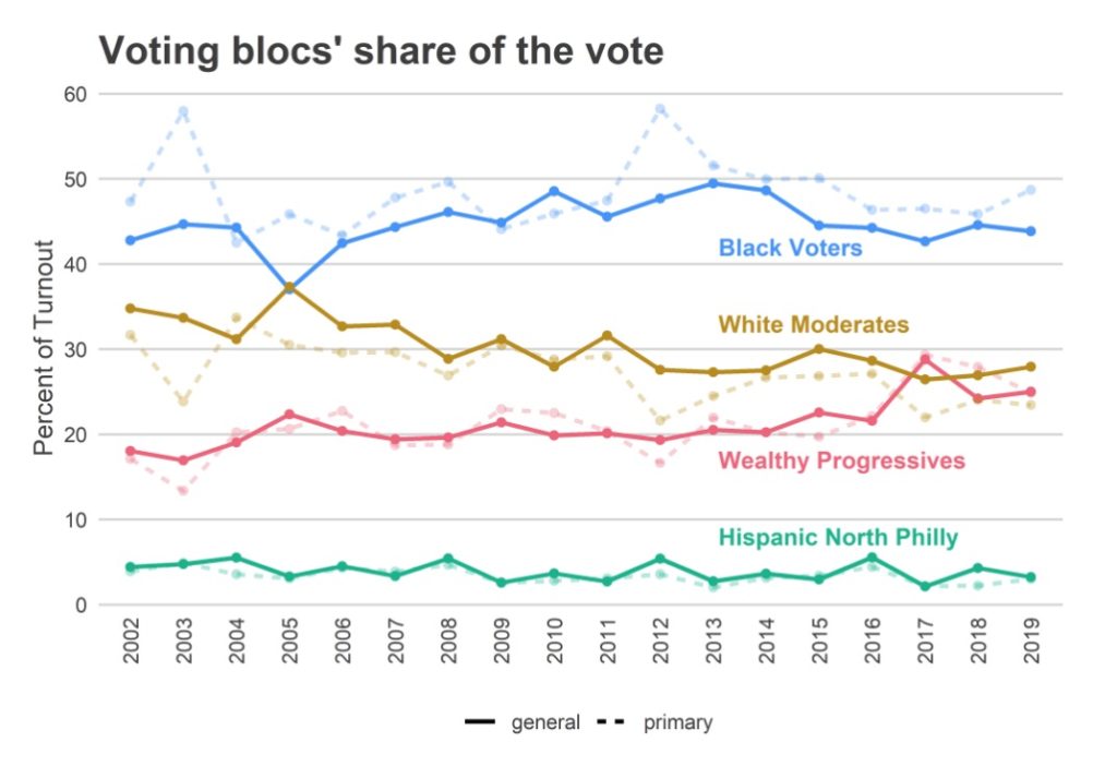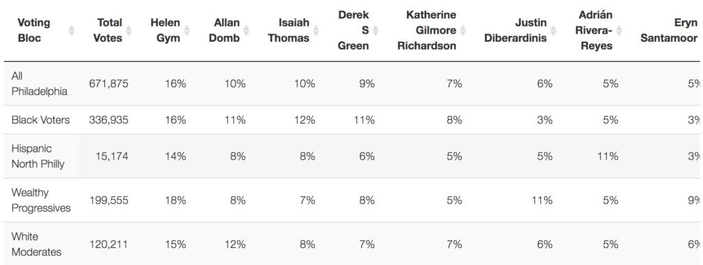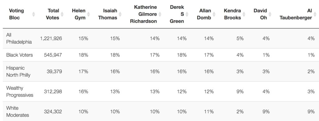 Tannen’s novel contribution was to group the divisions (precincts) that tend to vote most similarly, and group them into four clusters: Black Voters, White Moderates, Wealthy Progressives, and Hispanic North Philly. Obviously these don’t capture all of the nuances of the political and demographic splits in Philadelphia politics, but they do go a long way toward revealing some of the citywide voting coalitions that exist across neighborhoods.