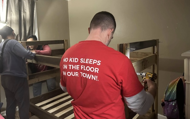 Once each individual component is finished, another team of volunteers delivers the beds to the kids’ homes and puts them together IKEA-style. They build two different models: twins and bunks. Along with the bed frames, families get mattresses, sheet sets, pillows and comforters.