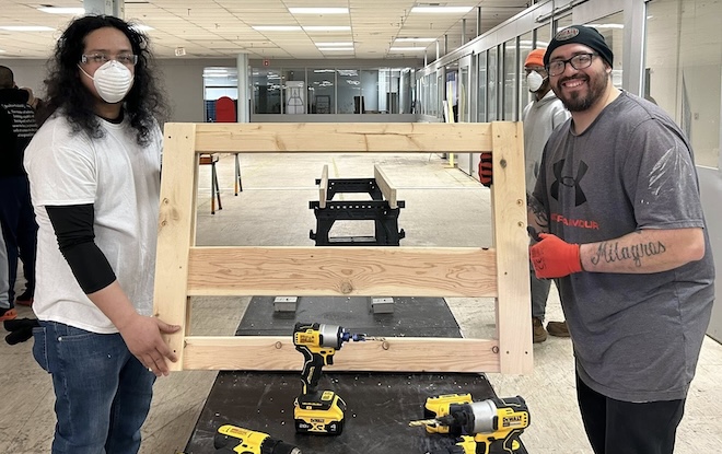 The building process uses an assembly line model Henry Ford would envy: One team of volunteers measures and saws; another drills holes; another sands. Fulton has hosted builds in parks and parking lots — it takes a lot of space to make the beds — but also school shops or garages.