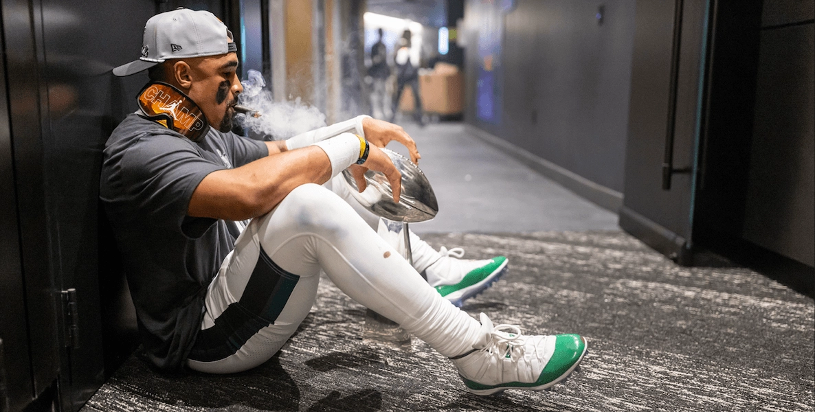 Jalen Hurts, taking a minute after the Super Bowl with the Lombardi Trophy, a stogie, and Frankie Beverly. Photo courtesy of the Philadelphia Eagles.