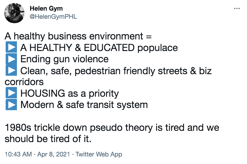 To Councilmember Helen Gym’s pointed observation about this, there is so much more to the competitiveness picture than simply twiddling the knobs on different tax rates. One of the biggest challenges for growing Philadelphia’s residential population is the underfunding of public schools, and also the perception that the School District is poorly-managed as well—a perception that’s only increased during the pandemic. A thriving business environment necessarily requires strong local public schools, an educated and trained workforce, well-run and cost-effective local public services, a high-quality public transit system, and all kinds of other public goods that contribute to economic vitality and quality-of-life.