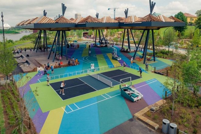 At Tom Lee Park in Memphis, basketball and pickleball courts are integrated into a 30-acre city park.