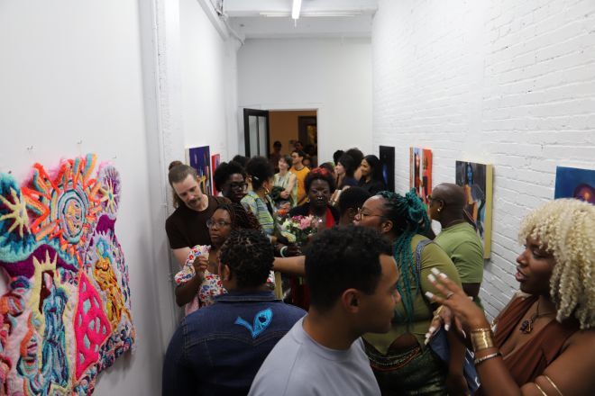 “I knew I wanted to center artists of color, women/femmes, local artists, and emerging artists,” says Luster. That commitment is reflective of her work at artist Isaiah Zagar’s Philadelphia’s Magic Gardens, where, as exhibitions manager, she curates regular guest exhibitions in addition to shows that highlight Zagar’s work. “I wanted to create conversations between emerging and established artists, people who had never shown work and people who have exhibited a lot,” she adds.