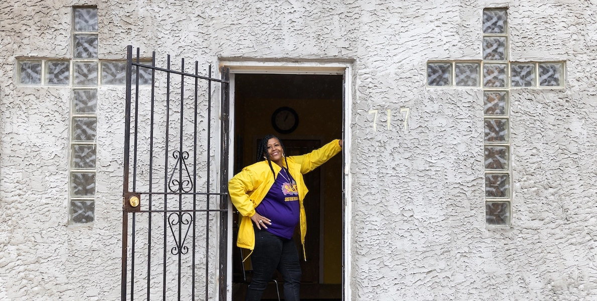 Michelle Simmons stands in the doorway of Why Not Prosper’s headquarters in Germantown, the Philadelphia neighborhood where she grew up. She founded the organization 20 years ago to help formerly incarcerated women like herself.
