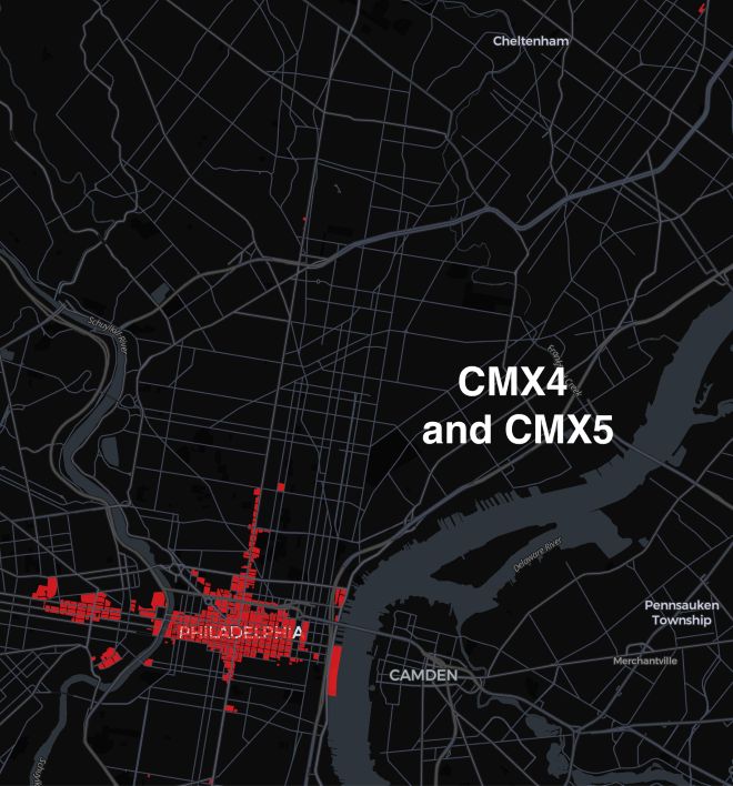 Compare that to the map above of CMX4 and 5, which mainly affects properties in the core of Center City and University City.