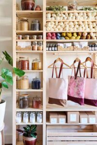 Hasan designed the space to reflect the process of natural dying. The right side of the store contains shelves of yarn, books, seeds, dried flowers and other plants that can be used for natural dying. The left features scarves, sweaters, headbands and other textiles Hasan has designed and dyed. In the center of the shop is a large table used for workshops. Eucalyptus leaves, like the ones featured in the shop’s logo, decorate the walls.