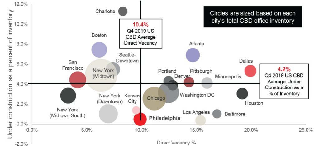 Walking around the Philadelphia central business district today, you’ll struggle to find many office properties under construction, even with the direct vacancy of that 9.9 percent, which is below the U.S. average. In fact, only two office properties are under construction: 300 Rouse and 400 Rouse, both single-tenant buildings at the Navy Yard, totaling 231,000 square feet—just 0.5 percent of Philadelphia’s CBD office inventory. This isn’t the case across the top 20 U.S. CBDs, where over 52 million square feet of office product are under construction. Looking at things another way, if office construction in Philadelphia happened at the average rate experienced across other CBDs, Philly would have roughly 2 million square feet of office product currently being developed […]
