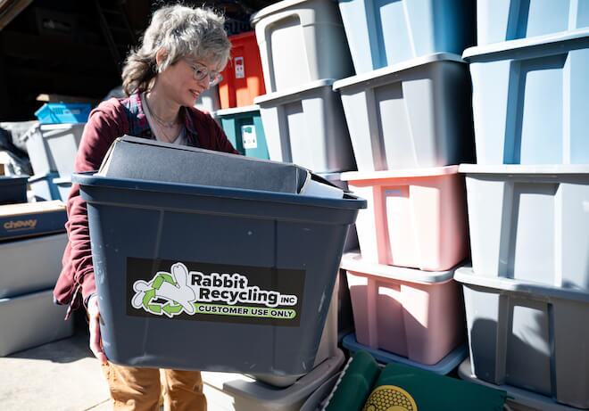 Matt Siegfried co-founded and operates Rabbit Recycling, a paid, on-demand service that specializes in transparent recycling, donation and upcycling for both common recyclables and hard-to-recycle materials. Just like with your blue bin recycling, Rabbit collects bins of plastics, aluminum, paper and glass — plus batteries, clothing, styrofoam, pots and pans, thumb drives, lightbulbs, and dozens more items that would otherwise end up in landfills or incinerators … — and finds domestic markets to process them.