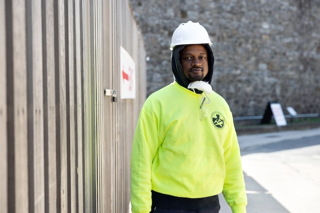 Abou Hinson, in a bright yellow sweatshirt, white hard hat, gloves and jeans, smiles in front of a stone brick wall at Eastern State Penitentiary.