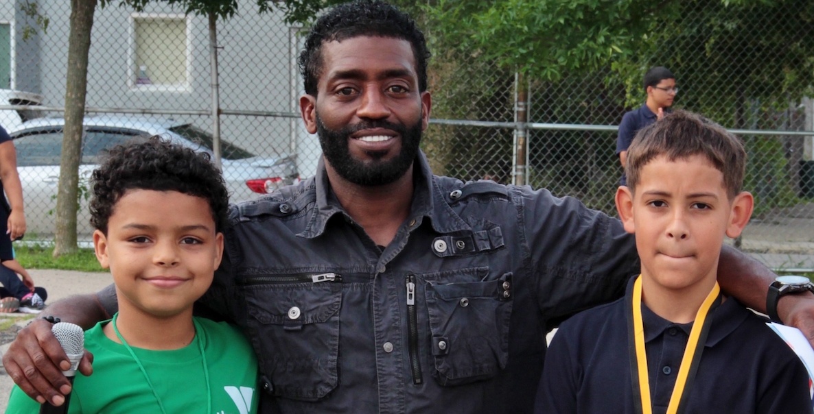 Shawn "Frogg" Banks with two of his soccer players. Courtesy Kensington Soccer Club.