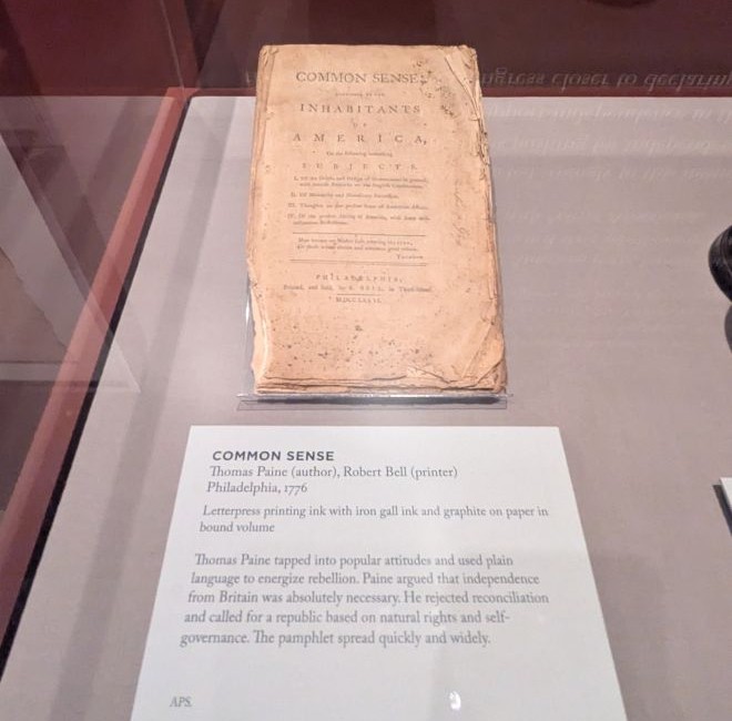 Other fascinating pieces include the proclamation from King George III declaring the colonies in rebellion against the crown, and the Continental Congress’s response. There’s a blank invitation printed by Benjamin Franklin to his July 5, 1779 Independence anniversary party in France. One of my personal favorite items in the collection is a 1776 printing of Thomas Paine’s Common Sense.