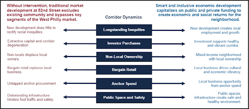 The 52nd Street Corridor was an important business and cultural hub for West Philadelphia’s African American community, known as “Black Main Street.” But it has suffered for decades from suburbanization, car-oriented development, corporate retailers, and pandemic disruptions to workforce, supply chain, and working capital.