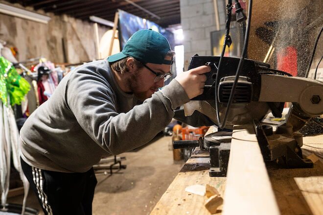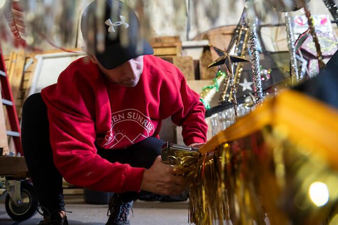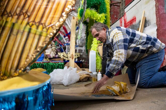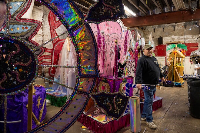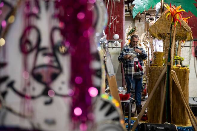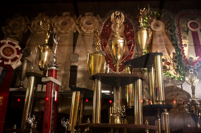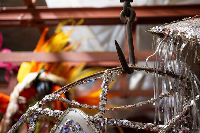 Maybe the long walk with a 250-pound getup in tow is what has caused the erosion of the Fancies. Maybe it’s the months of work that goes into each suit. Every Sunday, you’ll find members of Golden Sunrise hammering, measuring, hot gluing — lots of hot gluing — plywood, metal bits, iridescent fabrics and sequins in an old, slightly leaky former slaughterhouse in South Philly. (Cue the Rocky scene, if you must).