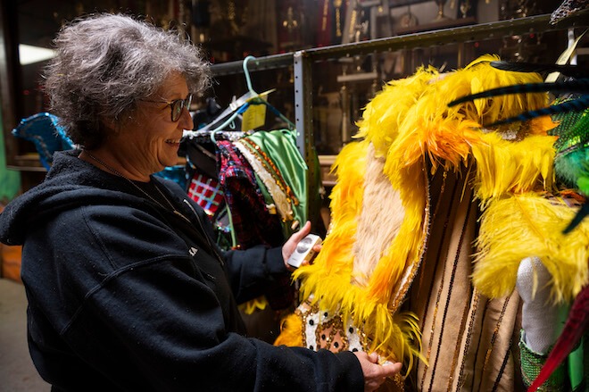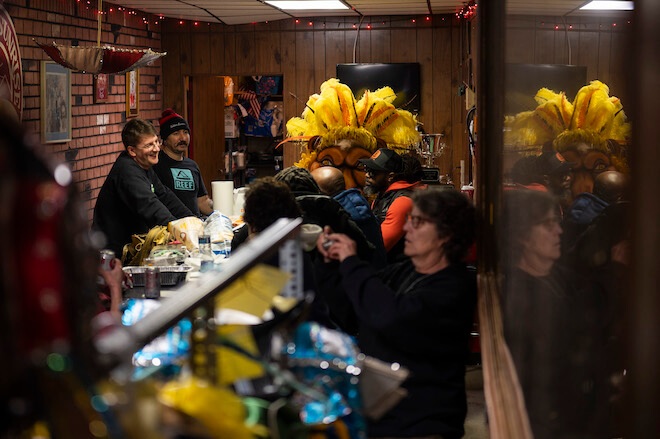 At the end of the clubhouse bar, a table holds a half-dozen brightly feathered and sequined and shiny gold costumes — literally made with the same materials and the same … aesthetic as those belonging to their Mummers brethren and sistren. Of course, the carnival look is more suited to 90-degree days than New Year’s Day.