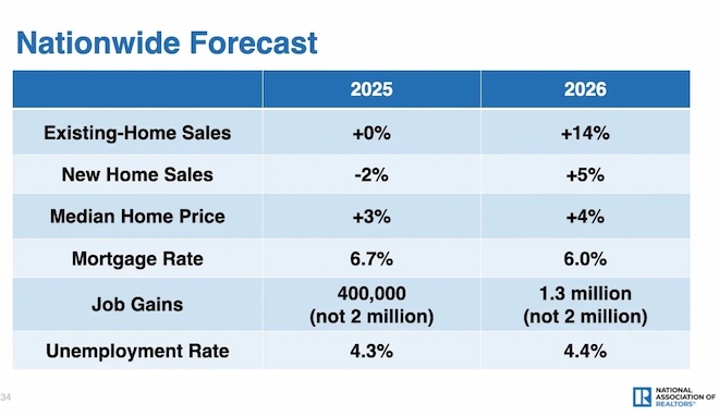 After so many years where the housing market was absolutely crazy, this was the year that the housing market stabilized, kind of. Housing prices rose moderately at about 3 percent. Inventory continued to grow in double digits. Sales were still very slow, but maybe that will set things up for a bigger year next year. Some predictions (below) from National Association of Realtors suggests that 2026 housing prices are still going to go up — but still around the pace of inflation — while the number of sales will increase, getting some healthy churn back into the market.