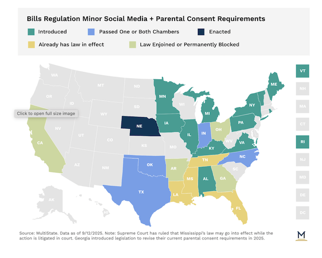 One of the things that gets me the most down is the sense that the tech overlords have control of our lives. It is then intriguing to see that eight states (Arkansas, California, Florida, Georgia, Louisiana, Mississippi, Ohio, and Tennessee) have enacted legislation that either bans minors from obtaining social media accounts outright and/or requires minors of certain ages to obtain parental consent in order to open accounts.
