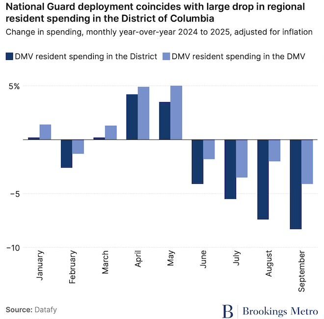 While we all have felt the daily impact of the Trump administration in different ways, perhaps nowhere has felt the brunt of the President’s chaotic and malicious regime as deeply as Washington, D.C. A recent report out of the Brookings Institution shows the dire impact of an array of issues in D.C. — the National Guard, DOGE and mass firings of the federal workforce. Not only is visitor demand down for D.C., Maryland and Virginia (known as the DMV), but so is local resident spending.
