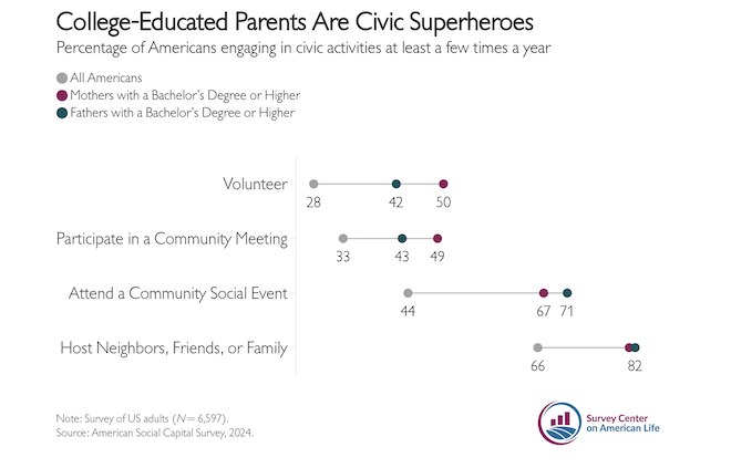 But here’s a counter-narrative. According to data from American Enterprise Institute, college-educated parents are the “civic super heroes” of our communities, and married parents without college degrees are more likely to be civically involved than others.