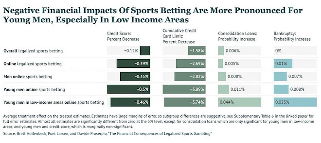 The average credit score in states that legalized sports betting decreased by 0.3 percent — and by one percent, three times the average, in states that allow online sports betting … This implies that a relatively small group of intensive users — “problem gamblers” — are suffering major damage to their credit scores, dragging down the overall average … The results were larger for young men from lower-income counties in those states. Meanwhile, states that legalized sports betting saw significant increases in bankruptcy filing rates and debt collections. Debt consolidation loans went up 8 percent by dollar value, and auto loan delinquencies increased 9 percent.
