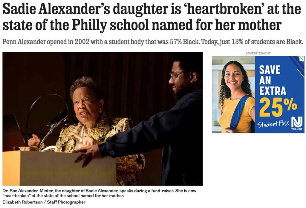 In Philadelphia, housing prices in one of the “best” school catchments, Penn Alexander, have seen extraordinary price appreciation ever since the University of Pennsylvania gave funding and other supports to the school. And the student body’s demographics have changed from 57 percent Black when it opened in 2002 to just 12 percent Black in 2023, leading the daughter of the school’s namesake to tell The Philadelphia Inquirer: