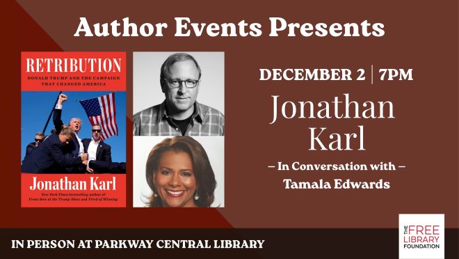 GO BEHIND THE SCENES OF THE PRESIDENCY. The Free Library Foundation Author Series continues December 2 from 7 to 8:30pm with Jonathan Karl | Retribution. Tamala Edwards, 6abc Action News Mornings co-anchor, speaks with the author about what went down in the 2024 presidential election. The Philadelphia Citizen is a proud media sponsor of the Free Library Foundation. $5. 1901 Vine Street.