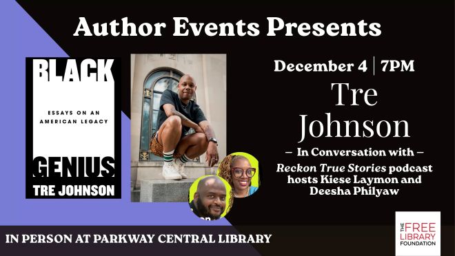 ATTEND A LIVE PODCAST TAPING ON BLACK GENIUS. The Free Library Foundation Author Events Series presents Tre Johnson in conversation with Reckon True Stories: Podcast hosts Kiese Laymon and Deesha Philyaw December 4 from 7 to 8pm. In this live taping of the Reckon True Stories podcast, author Tre Johnson talks about Black Genius: Essays on an American Legacy. The Philadelphia Citizen is a proud media sponsor of The Free Library Foundation. Free. 1901 Vine Street