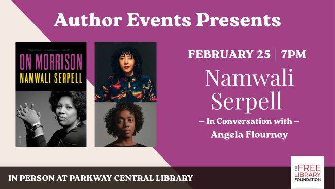COME TO AN AUTHOR EVENT CELEBRATING ANOTHER GREAT AUTHOR. On February 25 at 7pm, The Free Library Foundation Author Events Series presents Namwali Serpell | On Morrison, in Conversation with Angela Flournoy. Serpell draws on her experience as both an award-winning writer and professor who teaches a course on Morrison to illuminate her life and work. $5. 1901 Vine Street