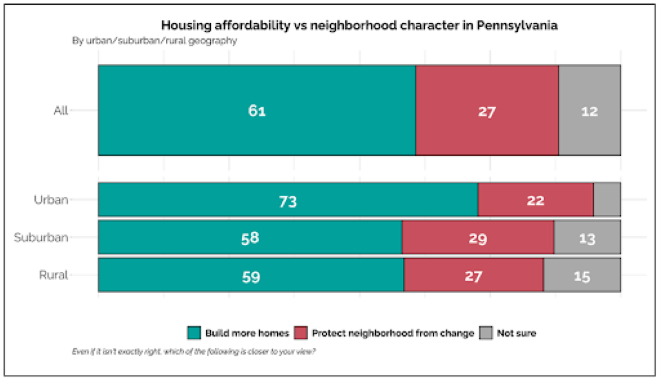 Real housing reform is popular, according to recent polling from YouGov, prepared for the PA Housing Choices Coalition — a coalition of over 50 organizations from across the ideological spectrum supporting pro-housing legislation in Harrisburg. It’s most popular with urban residents, who by a wide margin support building more housing, even when it conflicts with other priorities like local control or preserving neighborhood character.